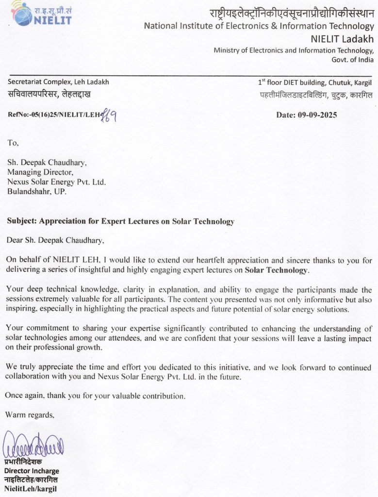The appreciation letter from NIELIT Ladakh is more than recognition—it’s a reflection of the value and impact Deepak Chaudhary has created in the solar sector. Through Nexus Solar Energy Pvt. Ltd., his lectures, and his practical insights, he has contributed significantly to India’s clean energy journey.